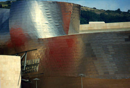 The only color in Gehry's Guggenheim comes from reflections on the unnaturally highly polished titanium sheets in which the building is clothed. Already it is showing stress and unwanted coloration.